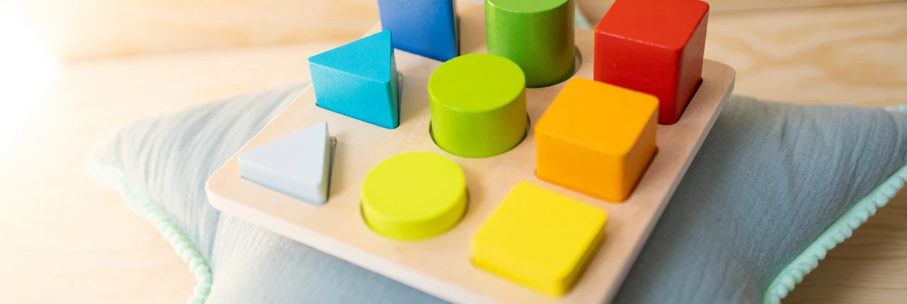 Négy különböző színű darab – négyzet, háromszög, ötszög és kör – könnyen fogható fa gombokkal. A..